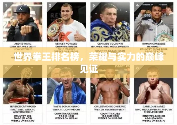 在拳击这项充满激情与斗志的竞技运动中,拳王是每位热爱拳击的人的楷模与榜样,世界拳王排名人员,是对拳击界顶尖选手的权威评价,代表着他们的实力、荣誉和影响力,本文将为您详细介绍世界拳王排名人员的评选标准、知名拳王以及背后的故事。